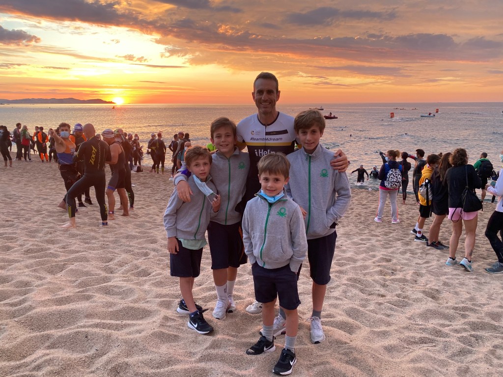 Llegué a la playa 30 minutos antes de la salida. Busqué a mi equipo por si acaso ya estaban allí. ¡Vaya si estaban! Habían cogido el primer sitio en la valla cerca de la salida del agua con unas pancartas que me emocionaron. Es increíble ver a 4 niños a las 6 de la mañana con esa cara de ilusión, sin una queja, prestos y dispuestos para animar a su padre. A mí estos momentos me dan la vida. Me ponen como una moto y cada brazada, cada pedalada y cada zancada, va por ellos.