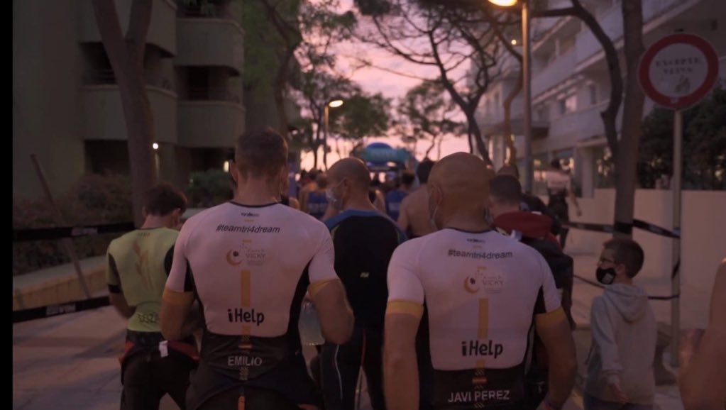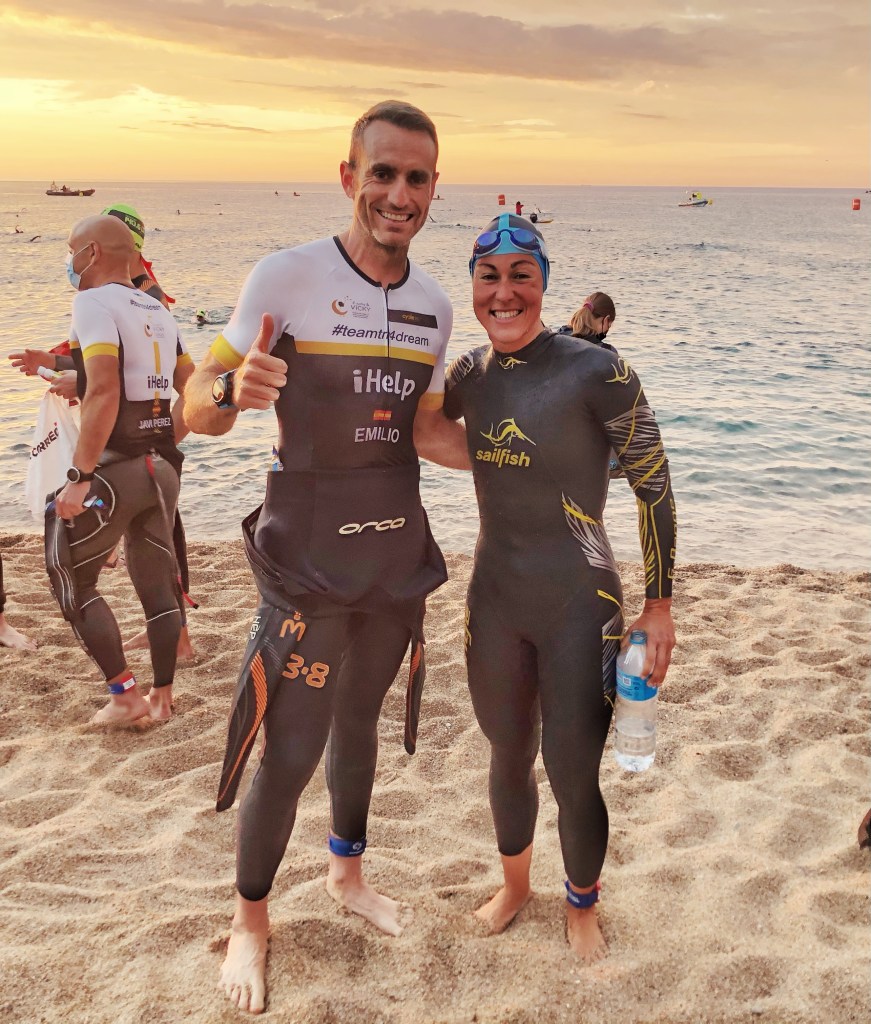 El día había pasado volando. Al final quieres descansar pero es imposible. Sin duda es lo que más tensión me genera en un evento así. Las horas previas son duras. El tener todo controlado, que no se olvide nada. Venía con los deberes hechos. Me encontraba muy bien tanto física como mentalmente a pesar de los típicos traumas pre competición que nos salen. Un picorcillo de garganta que no sabes si va a acabar en algo más serio, dolor de cabeza repentino, algo de tos y un poco de afonía… vamos, que no falla. Siempre igual. Quieres estar tan bien el día de la prueba, hay tanto sacrificio detrás, que el cuerpo humano es sabio, sabe que tienes un estrés brutal y aparecen pequeñas cositas que te piensas que van a arruinarte la carrera. En la T1 me encontré con muchos amigos. Cómo mola ver caras conocidas en las carreras. También me saluda bastante gente de las redes sociales. «¡Vamos Emilio, Vamos Tri4dream!» Alucino con el alcance de las RRSS. Y eso que no llego ni a 3000 seguidores. También me encontré con Gurutze Frade. Me encantó entrevistarla en «Entrevistas del confinamiento» y tuve la suerte de verla en Playa de Aro recién llegada de EEUU donde había quedado 5ª y conseguido su pasaporte para Kona. Uno más.