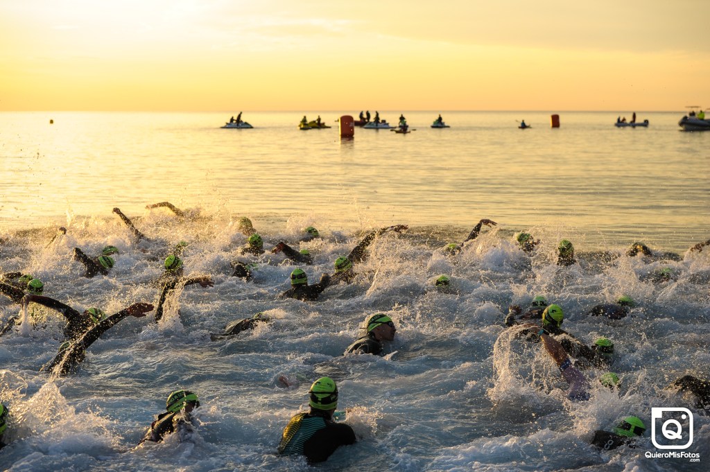 Yo sabía que en este sector era dónde más flojo me había sentido entrenando. No es mi fuerte. No disfruto mucho nadando, pero sí me veía bien para salvar con una buena nota los 3800m y arrancar con optimismo mi sector favorito: el ciclismo. Salimos en tandas de cuatro triatletas cada 5” creo recordar. Vi a Carlos Vives con gorro de neopreno delante de mí. Pensé que a lo mejor debí de traerme el mío. Y lo corroboré cuando metí por primera vez la cabeza en el agua. ¡Ufff, qué fría, por favor! Creo que eran 17 grados, pero me parecieron 10. Ni punto de comparación con la Malvarrosa en Koa Distance en octubre de 2020. Pasé unos primeros metros complicados. Tenía frío. Pero frío de verdad. Sé que muchos no lo notasteis, pero a mí me pareció estar nadando en algún país nórdico.