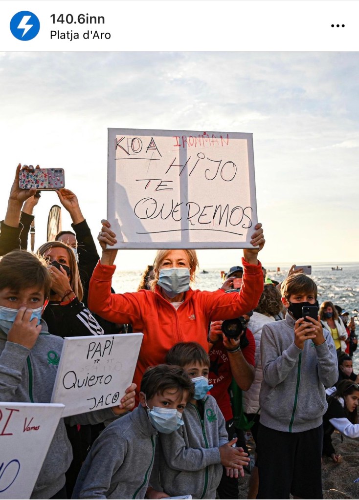 La playa estaba espectacular. Ambientazo. Me pegué al lado derecho para buscar rápido a los míos. Y los encontré, cómo no. Ahí estaban con sus pancartas y esperándome para chocarme la mano. ¡Qué momento! Les supo a poco y salieron corriendo conmigo hacia la T1. Lucas grabando el momento con el móvil (¡Qué gran trabajo, Luquitas) y Pablo, Bosco, Jacobo, mi madre y mi primo corriendo por la acera a mi lado. ¡Cracks!