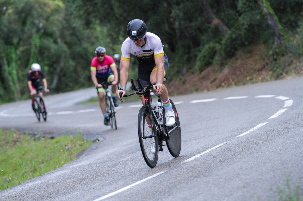 Subí el primer puerto muy fácil. La Romanya era la primera dificultad montañosa del día. Ya conocía el terreno porque fui con Diego Infante y la gente de Bétera a reconocerlo el viernes. Puerto tendido, cómodo y donde casi clavé los vatios establecidos: 275w y 135 de pulso medio. Tenía la sensación de ir en bici eléctrica. Antes de coronar empezó a chispear. Pensé que era una buena noticia. Me gusta el calor, pero no estábamos bien adaptados todavía y prefería una bici fresquita. Pero de repente el chispeo se convirtió en un diluvio universal. Antes de coronar pasé a Ironmanu. Me puse contento al verle. Es un gran chaval. Un apasionado de este deporte.