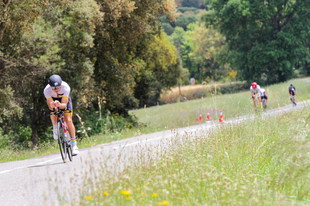 Después de los dos primeros puertos teníamos un falso llano con muchos toboganes donde disfruté mucho del paisaje y de la sensación de ir adelantando constantemente a gente. La verdad es que como nadé regular tuve que recuperar bastantes posiciones. Si no me falla la memoria ahora mismo, fueron 354 puestos del agua al término de la bici. En el Garmin tenía un lap de 1h por este tramo donde sin duda es el más rápido del circuito, a pesar de algún punto conflictivo y algún camino de cabras que nos complicó la vida. Hice 36 de media en esta mini contrareloj a 220w. Pensándolo ahora en frío, aquí reservé demasiado. Tenía que haber apretado más, aprovechar lo bien que voy acoplado y lo fuerte que me siento y haber recuperado todo, o casi todo el tiempo perdido bajando la Romanya. Pero la maratón seguía rondando la cabeza con el dichoso St. Grau de fondo martilleándome la cabeza y tenía que concentrarme para no ponerme en zona 70.3 acoplado.
