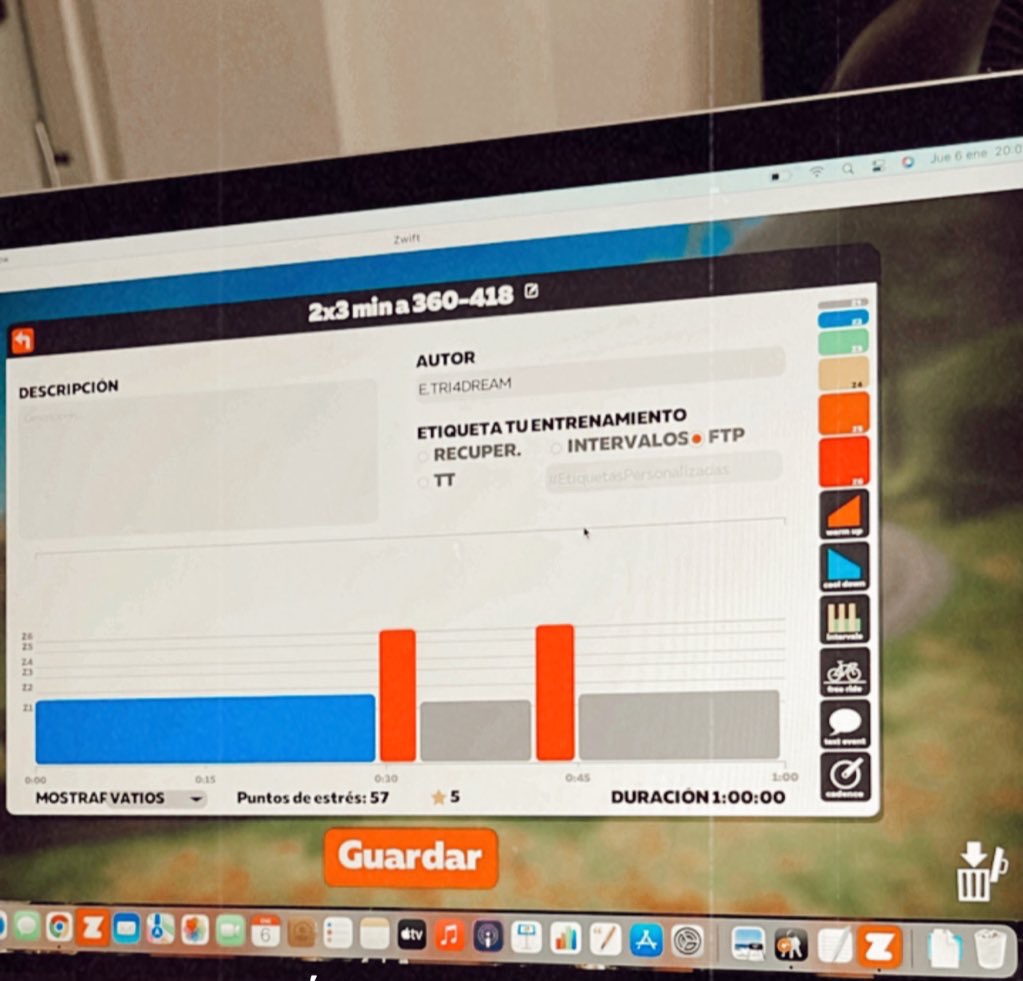 Al final hubo tiempo para todo. Después de ir a Becerril a comer con los abuelos, a eso de las 20:00 me monté en el potro de tortura para cumplir con un 2×3’ en zona 6 que me tenía preparado Arroyo. Antes del IRONMAN tenía el FTP en 313w, pero después del post IM y el descanso pertinente WKO5 me lo ha bajado a 286.
