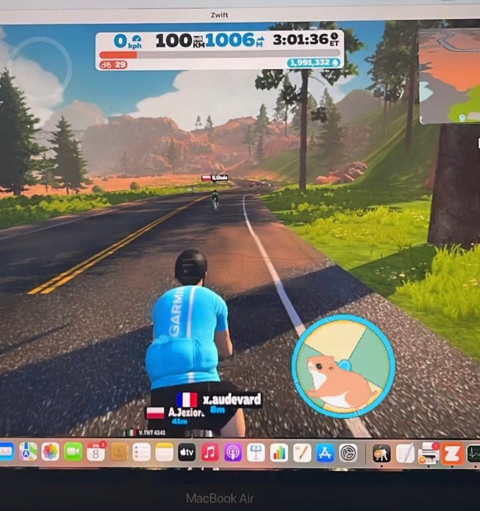Eso sí, la idea era clara: 3h debían de caer sí o sí. Sin excusas. Me preparé 3 bidones de Iso e Hidrazero de 226ers, café solo y arranqué en ayunas. La primera hora solo con Hidrazero y luego ya empecé a comer. Elegí una ruta de Watopia. 70km con +753. Así se me hace más ameno. Tener una ruta y una distancia por hacer me lo pone más fácil.