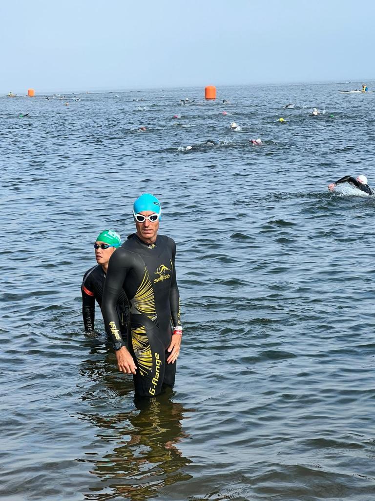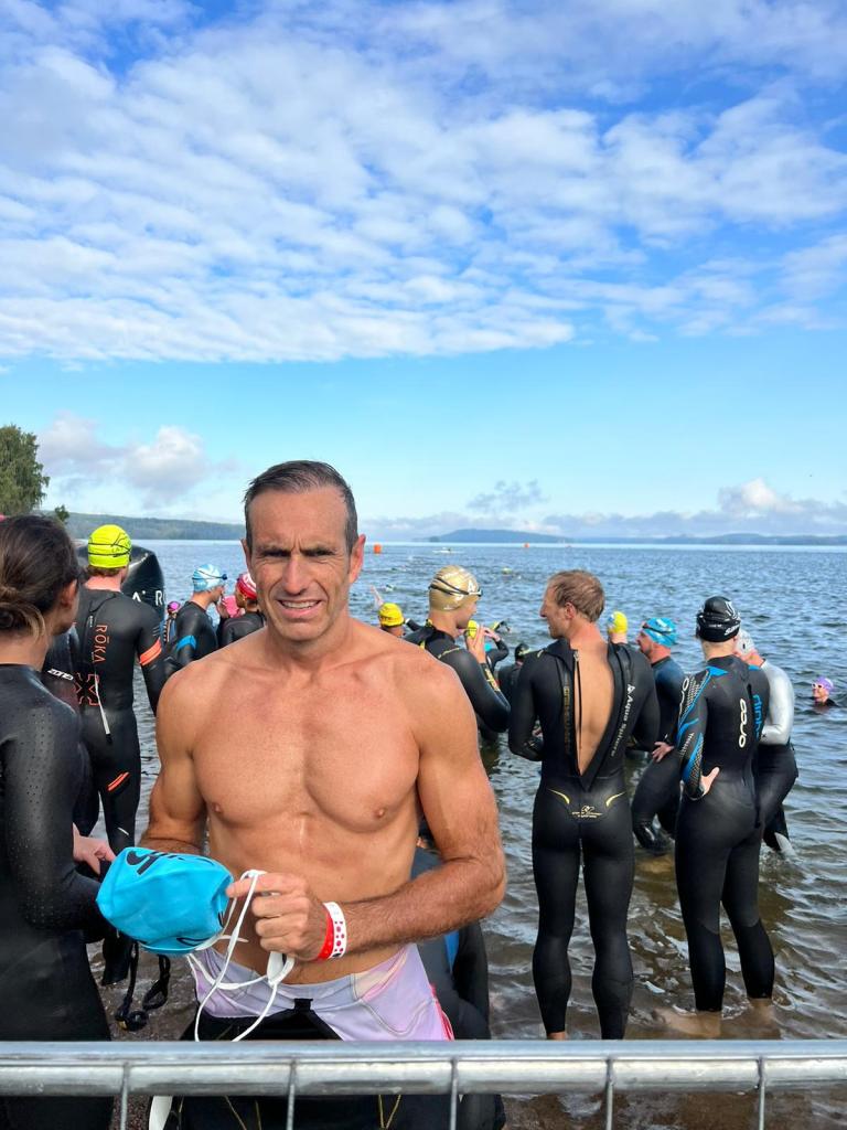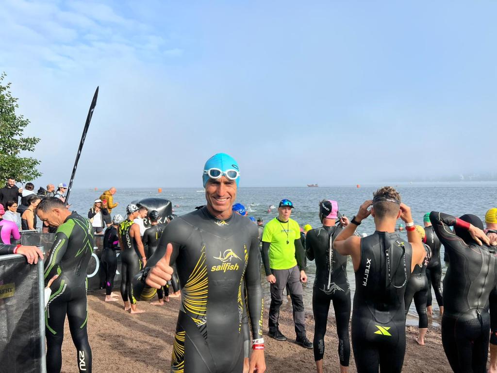 Estaba tranquilo, pero con un pequeño nudo en el estómago. Allí estaba el Shimano Bike Center. El cambio estaba supuestamente en el mejor lugar posible. Allí la dejé y me dijeron que hasta el sábado por la mañana no la tendrían lista. Poco más podía hacer, así que decidí irme a nadar al lago de la carrera, situado a 1km aproximadamente de la zona de meta. La temperatura era muy buena. Sobre los 20 grados. Me cambié en el coche. Me puse un mono de competición para nadar con el Sailfish G-Range. Es un neopreno con una elasticidad tremenda, súper fino y no voy cómodo. A primera vista me queda perfecto, muy bien asustado, pero en cuanto nado me entra agua. La talla S es pequeña y la SM ( la siguiente) me hincho como una foca.